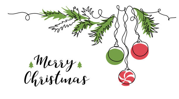 Xmas Fir Twig With Christmas Tree Toys One Continuous Line Art